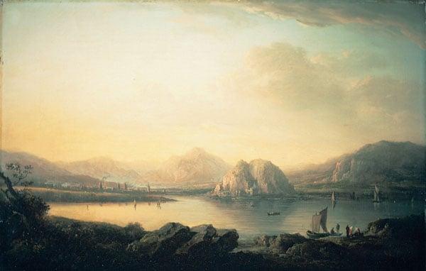 This is a view of Dumbarton with its castle and the distant Ben Lomond taken from the southern bank of the Clyde. It is unusual due to its depiction of the early industrial development of this part of the Clyde, and the smoking glass furnaces of the town of Dumbarton are a recognisable intrusion into the otherwise wild landscape.