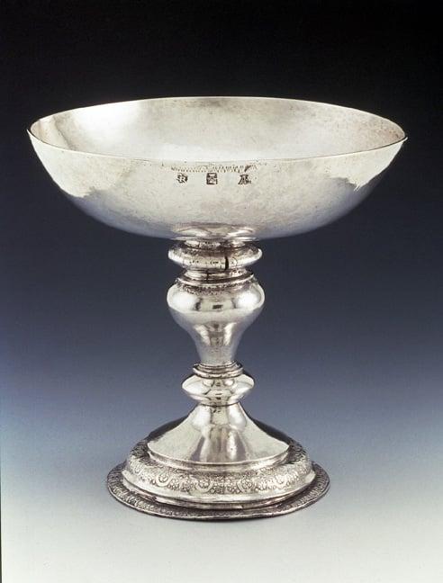 Communion cups are undoubtedly the major glory of early 17th century Scottish silver, and indeed they form the majority of surviving examples of the work of Scottish seventeenth-century goldsmiths. The Dunfermline Abbey cups represent a style at once typical and beautiful. They carryover some stylistic elements from the mazers of the previous century, particularly the egg and dart decoration of the feet coupled with a simple elegance and functionalism.