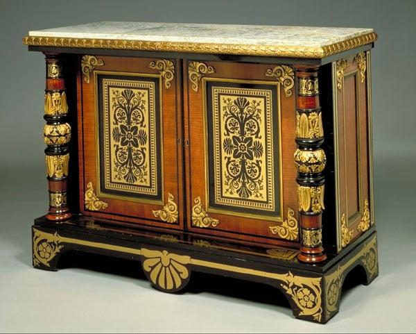 Top made in Glen tilt marble, fitted with panelled doors concealing twin tiers of six drawers sliding on side runners. Inscription on the doors of the cabinet reads 'For/Mrs Barrows/Oak Book Commode/Pubd. Augt. 1816'. Bullock was a pioneer in the use of native materials, partly of necessity since he was working during and immediately after the Napoleonic Wars.