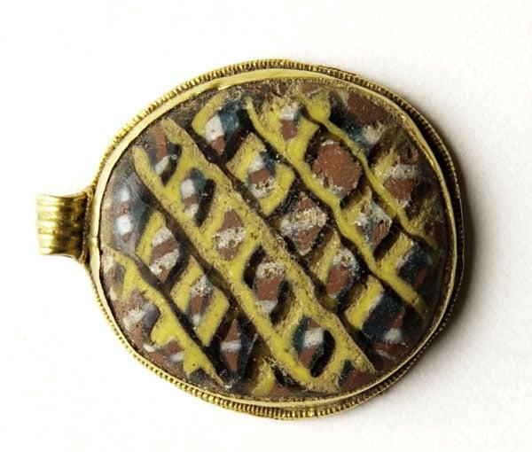 This oval pendant is particularly unusual because it was formed from reusing Roman mosaic glass, instead of the more common gold and garnet fittings. It provides evidence of the trend of Romanitas or adoption of Roman fashion styles in Early Saxon England. Being gold backed, the pendant was a high-status decorative object, owned and worn by a member of the upper classes of Saxon society. Lynn Museum has a fine collection of over 300 locally found Saxon artifacts, but only a handful of these objects are made from gold or gilded. This is the first Saxon pendant to enter the collection.