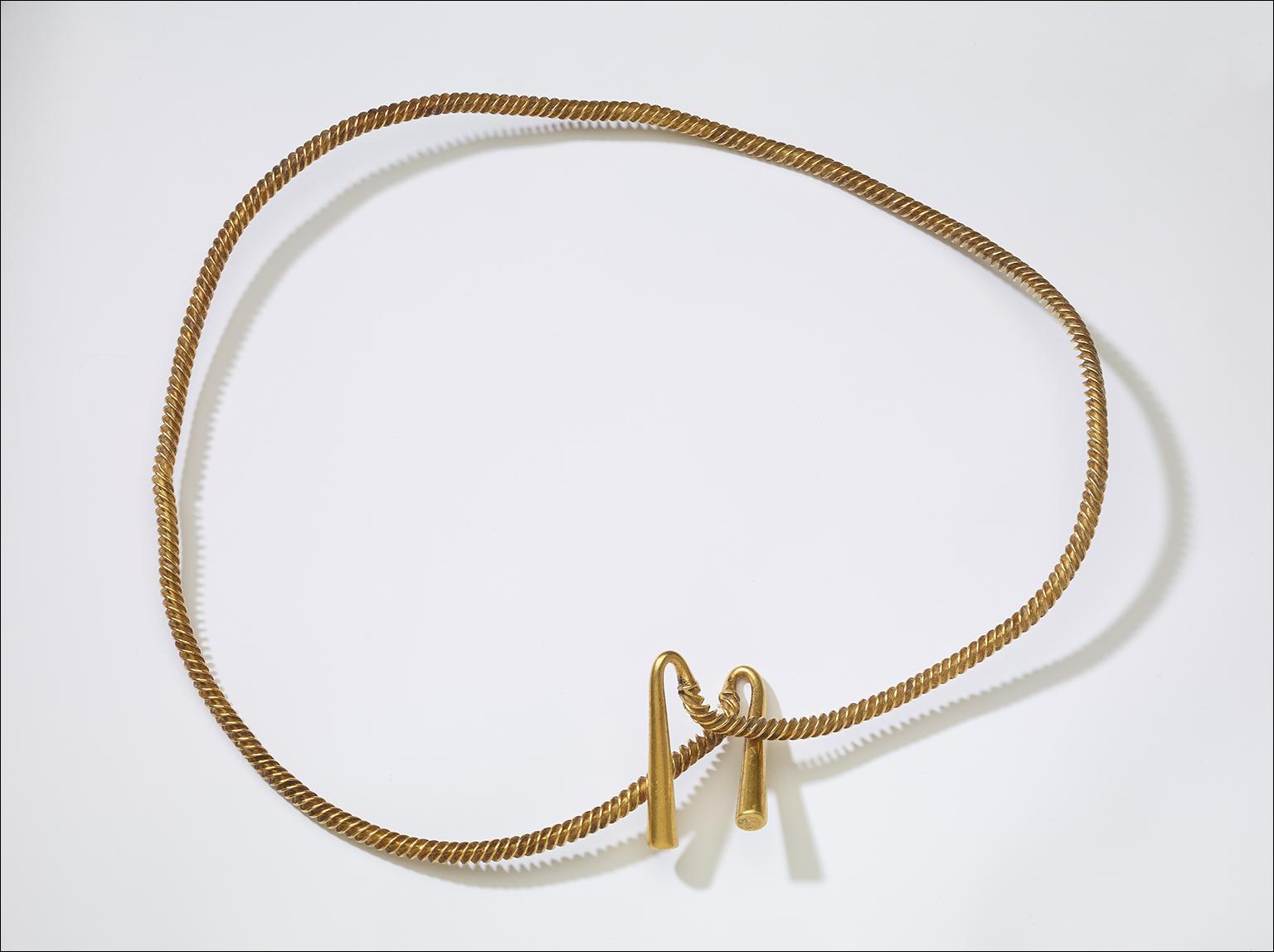 This remarkable gold torc, a type of metal band worn around the neck or body, was found by a metal detectorist in a field in East Cambridgeshire in 2015. It dates back to the Middle Bronze Age (more than 3,000 years ago) and is one of the largest and heaviest torcs ever found in the British Isles. The piece is made of three components: two trumpet-shaped terminals and a long, spiral-twisted gold bar. The workmanship demonstrated is both highly skilled and aesthetically pleasing. Most previously discovered torcs are much smaller in scale, which raises the question of how this one was used. Experts have suggested that it might have been worn by a pregnant woman or used to adorn an animal about to be sacrificed. Ely Museum collects items that reflect the history and heritage of East Cambridgeshire. Among existing holdings are tools, weaponry and gold jewellery from the Bronze Age period, all found locally. This nationally significant archaeological find now becomes the first torc to enter the collection and the centrepiece of its Prehistory Gallery.