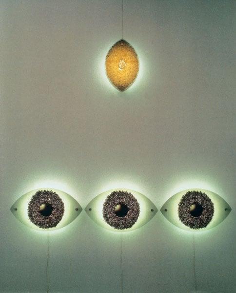 Three elliptical-shaped light boxes arranged in a line. Each has a photograph of a circle of bluebells with a black liquid in the centre, made to resemble an eye. An additional light box is suspended approximatley 1.5m above and at right-angles. This is covered by a photograph of yellow petals with a raw oyster in its shell at the centre. The lightboxes are intended to give life to the inanimate images. Animal and vegetable material are used in many of the artist's works.