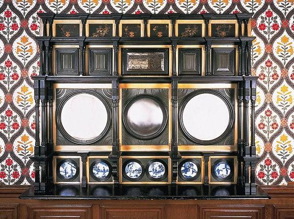 Comprises of a wooden frame divided into 4 tiers. Top tier has a row of 6 Japanese lacquer panels. Main (3rd) tier has 2 white marble portrait roundels carved in low relief flanking a mirror. Bottom tier has a row of 6 Chinese porcelain plates.