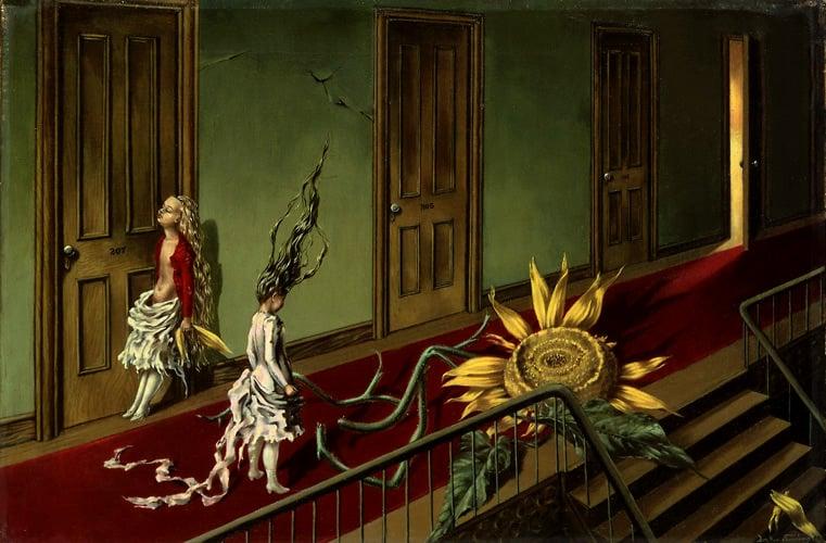 Two of its petals are on the stairs and a third is held by a doll dressed in tattered garments leaning against a door. Nearby stands a girl, whose hair flies upwards as though struck by a violent gust of wind. According to the artist, the sunflower represents the 'never-ending battle we wage with unknown forces'.