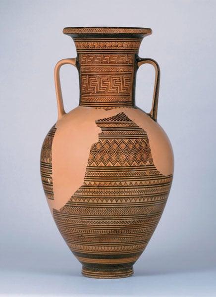 The geometric pottery amphora is made up from 15 fragments which have recently been restored. The surface is covered with an intricate web of half-tone decoration. An elaborate 'tapestry' pattern fills the widest zone around the middle, a chequerboard motif decorates the shoulder and an elongated double meander emphasises the elegant neck. A frieze of water birds fills the narrow zone below the rim. This work was acquired with assistance from the Wolfson Foundation.