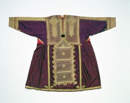 Embroidered indoor robe for a Brahui Noblewoman of deep purple Bokhara silk finely embroidered in silver-gilt thread over the whole front. From Eastern Baluchistan. Probably made late nineteenth century.