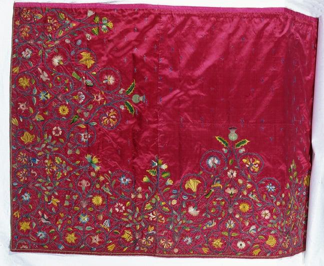 A silk panel embroidered with scrolling flowers, thistles, pea pods, birds and butterflies. Possibly from a skirt.