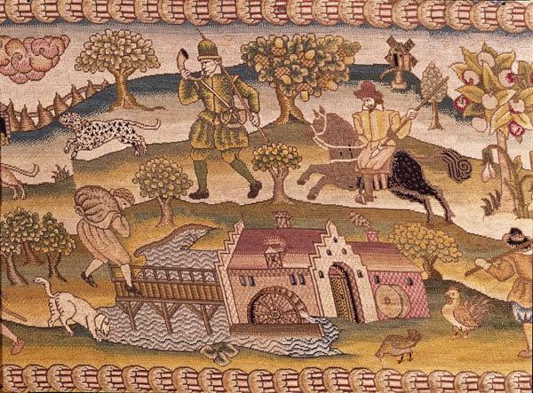 Embroidered with polychrome silks in petit point, depicting rural scenes.