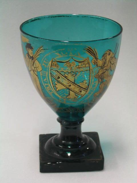 This rummer-shaped glass was enamelled and gilded by the Yarmouth decorator of ceramics and glass William Absolon and bears the arms of Admiral Lord Horatio Nelson. Nelson was born in Norfolk and landed in Yarmouth in 1800 when, according to a contemporary source, Absolon 'presented the hero with two glasses of local manufacture', of which this is one. Nelson was made a Baronet in 1798 and the form of this crest reflects this.