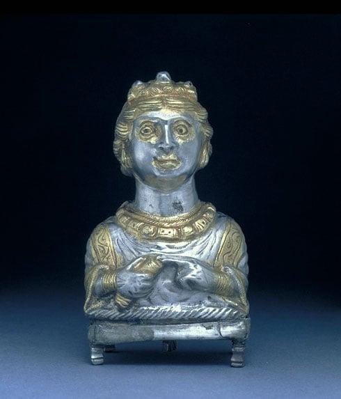 A decorative table utensil in the form of a bust of an empress. It is hollow and details of the Empress's jewellery and rich clothing are guilded. She probably does not represent a particular woman but is a generic representation. Four pepper pots were among the treasure found at Hoxne.