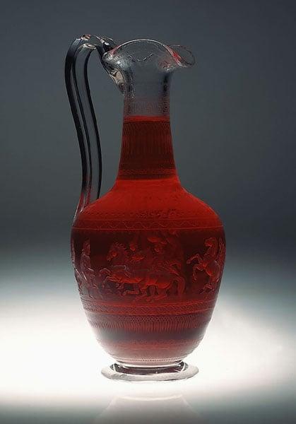 Engraved ewer with tapering neck and circular foot depicting equestrian figures after the Elgin marbles. Goblet engraved with similar figures above a hollow ball knop and facested stem.