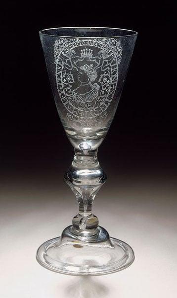 A lead glass baluster wine glass on a domed folded foot, with a hollow stem and round funnel bowl. The bowl is engraved in diamond point with a portrait of Queen Anne beneath a crown held by two putti within a wreath.
