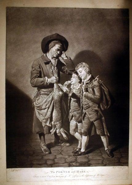 Prints by Richard Earlom after Zoffany including ' The Porter and the Hare' illustrated here. Also works by: John Smith, after Walton; C Josi, after Morland; L Ruet, after Meissonier; G Bartolozzi, after Downman; Collyer, after Downman; and PW Tomkins, after Downman. Two works on loan to Bath, No 1 Royal Crescent according to 2004 audit.