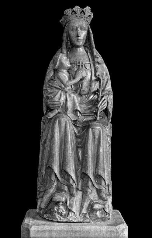 Sculpture of an enthroned Virgin, crowned and holding a lily with an angel holding a book under the Virgin's right foot. The figure came from France but the work itself is English.