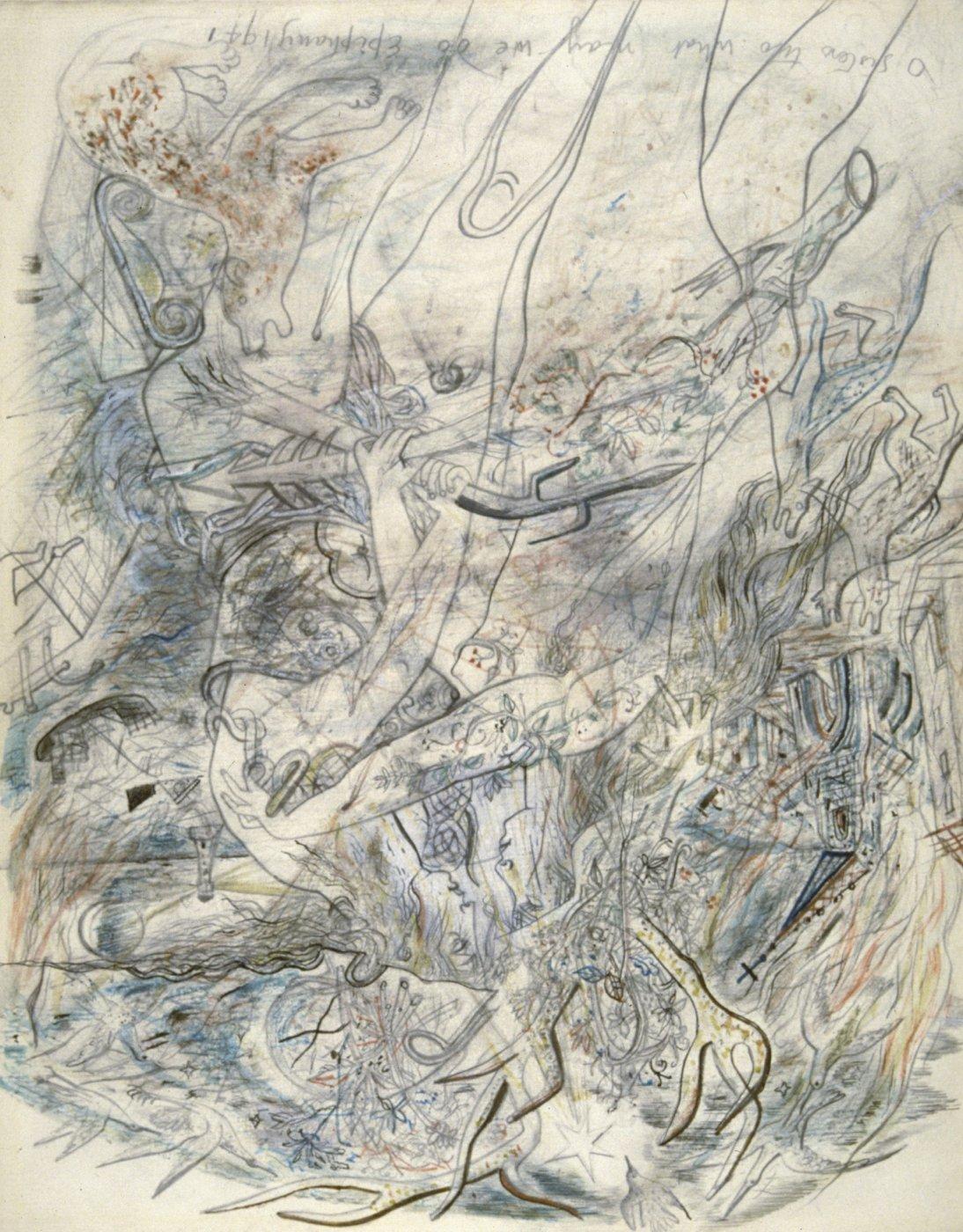 It is dedicated to, among others, 'the enemy front-fighters who shared our pains against whom we found ourselves by misadventure', a clear indication of his solidarity with the enemy that finds further expression in this drawing. The inscription 'Oh Sisters Two, what shall we do' is a line from the Coventry Carol, associated with the theme of the Massacre of the Innocents.