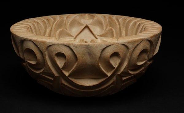 This work is named after the Euphrates river which flows from Turkey to the Persian Gulf. The flow of the river is represented by the curving lines running across the inner surface of the piece. The geometric patterning and symmetry show the Islamic influence on Cassell's work. The artist uses heavily grogged clay that allows her to utilise relatively thick surfaces to carve to the desired depth. The artist studied and lives in Lancashire.