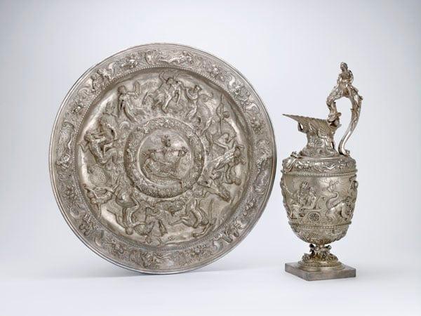 One of the smaller of the 3 similar sets from the Lomellini silver. Both have decorative schemes illustrating the loves of the gods, and may have been intended as marriage pieces. The lighthouse to the right of the centre medallion is the Lanterna or Torre di Faro, Genoa. By a Flemish goldsmith in Genoa. Another ewer and basin from the Lomellini silver was acquired by the V&A in 1974 with a grant from the Art Fund.