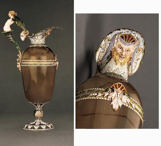 Renaissance-revival ewer. Body carved in agate with enamelled foot, neck and handle. Winged female figure forms the handle at the end of which is a man's face. At the tip of the female's wings is a rams head.