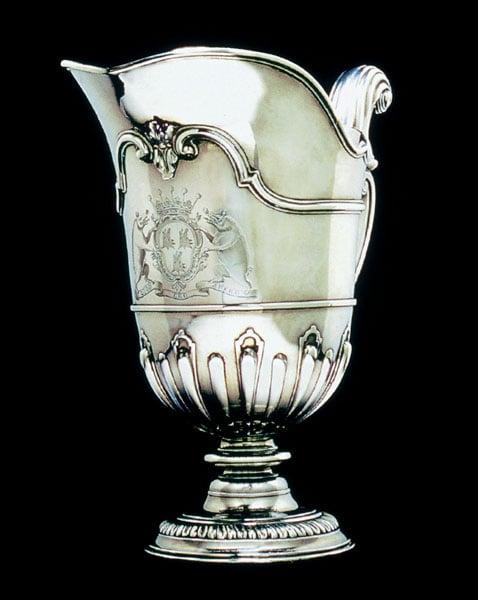 A helmet shaped George II silver ewer from the Warrington plate. The ewer has a spreading circular foot with a band of gadrooning, the lower part of the body applied with strapwork and above with two molded bands, with molded shaped rim and leaf-capped scroll handle, engraved with the Earl's armorials. The ewer bears the mark of the Huguenot goldsmith David Willaume II. Amongst his most important patrons in the early 1740's was George Booth, 2nd Earl of Warrington, of Dunham Massey. Lord Warrington was at the height of the silver-buying at the time and Willaume provided him with some of the most magnificent of his later acquisitions.
