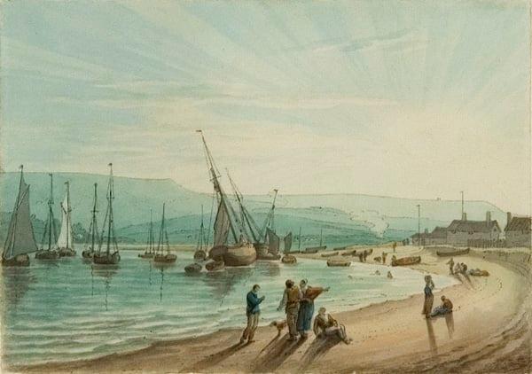 View of the port of Exmouth in Devon at sunrise or sunset. The artist painted mainly in the vicinity of Exeter, where he lived and worked as an apothecary. The palette of brown and blue and bold outline drawing, influenced by Francis Towne, conveys a strong sense of radiant light, shadow and atmosphere.