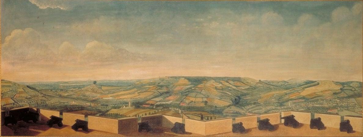 Fort George, a folly later called Rodborough Fort, was built by 'Captain' George Hawker in 1765 on land taken from Rodborough Common near Stroud. Viewed over a battery of cannon placed on the roof of the Fort, the panorama extends from Selsley Hill and Deadman's Acre on the left to Stroud on the right. A distant view of the River Severn can be glimpsed and the villages along the River Frome can be identified from the left. The painting is fascinating as a document not only of the appearance of the towns and villages along the Frome (now almost entirely swallowed up into Stroud) but also of the extent of the textile industry for which the area was internationally renowned.