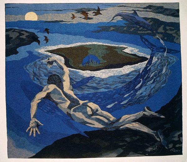 This tapestry was specially made for a themed exhibition at the Orkney Museum called 'Art based on Orkney Folklore'. The Finn Men and their mermaid wives were believed to live in cities under the sea in winter, in summer living in Hildaland - islands invisible to mortal eyes. The Orkney island of Eynhallow was believed to have been captured by magic from the Finn Folk.