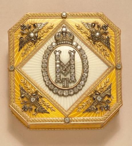 This handsome box in cast and chained gold from the Perchin workshop is enamelled in yellow and white, set with the crowned cipher of Nicholas II. It is executed in diamonds in a diamond frame, surrounded by four double-healed eagles enamelled in black. The box was almost certainly made for the Tsar for the purposes of presentation.