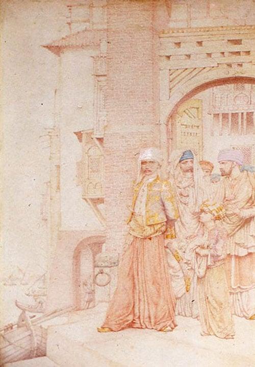During a tour to the Middle East, Richard Dadd developed paranoid delusions that he was being persecuted by the devil and on his return to Britain he brutally murdered his father, believing him to be the devil in disguise. He escaped abroad only to spend ten months in a French lunatic asylum. After being extradited, he was confined in the state criminal lunatic asylum attached to Bethlem hospital from 1844 to 1864 and then in Broadmoor for the remaining 22 years of his life. He continued to paint but never recovered his sanity. Both the Middle Eastern and French episodes have a bearing on this work. He has titled the work in French and signed it 'Monsr. R. Dadd', although 21 years had elapsed since his confinement in France. The subject is drawn from memories of the ill-fated Middle Eastern trip, the foreground figure almost certainly intended to represent Sir Thomas Phillips, Dadd's patron and travelling companion on his Middle Eastern journey