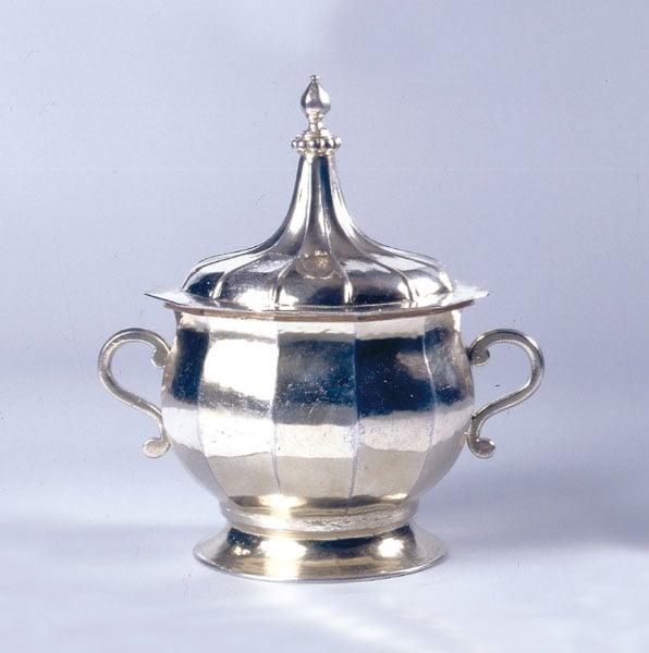 A twelve sided covered cup with opposing scroll handles and a plain cylindrical foot. The bowl bears the arms of Thomas Belasyse, a chevron between three fleur-de-lis impaling those of his first wife Mildred, daughter of Viscount Castleton. A porringer of the size and quality of the Fauconberg cup could be used for caudle, a hot spicy drink of ale or wine whisked into an emulsion with egg yolks.