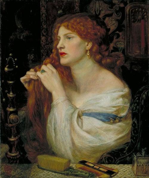 A woman, plaiting her red hair before a carved ebony mirror, is seated in an embossed velvet chair. A jade brush and a curious double comb lie on the table. Miss Fanny Cornforth (Mrs. Schott) was the model for this picture.
