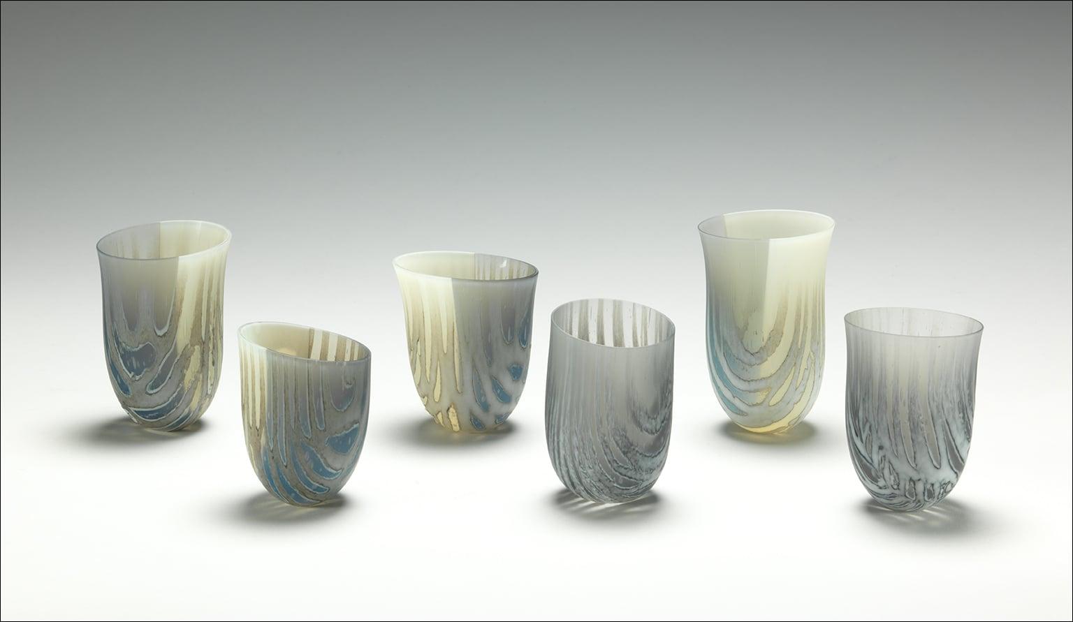 This delicate collection of vessels was created by Amanda Simmons, a Scottish glass-maker who specialises in kiln-formed pieces. Her use of opaque glass powders creates surfaces with varying translucencies as they elongate during the firing process, making every object unique.