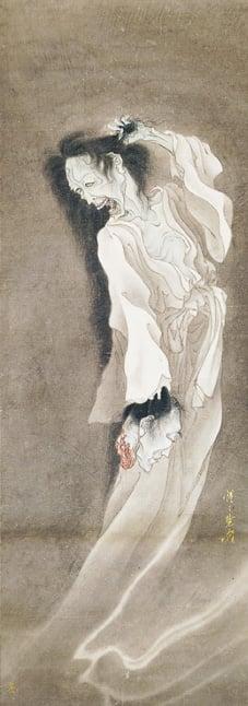 There was a significant vogue for paintings and prints of ghosts in Japan in the 19th century and many restless spirits of the dead haunt Kabuki plays and public storytelling of that period. Kyosai's ghost paintings were among those collected by the master storyteller San'yutei Encho, and exhibited each summer at Zensho-an Temple,Tokyo with ghost stories told in front of them. This example is among the most fascinating: blood drips from the ghost's fangs, and her hooded green eyes are creepily embellished with gold. Tugging herself upwards by the hair, she glides up and away with shrieking grimace on an ectoplasmic cloud. By contrast, the calm, almost resigned, expression of the severed head is all the more unsettling. Ghost paintings were traditionally hung at the stifling height of summer when any chill down the spine was welcome relief.