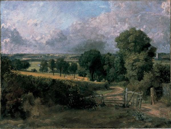 A landscape scene painted during the artist's long visit to Suffolk. The mud lane winds through the countryside bordered by hedges, fields and trees. Reapers can be seen working in the field on the left. The painting is unfinished and seems to have been started in the open air. This work was acquired with assistance from the Wolfson Foundation.