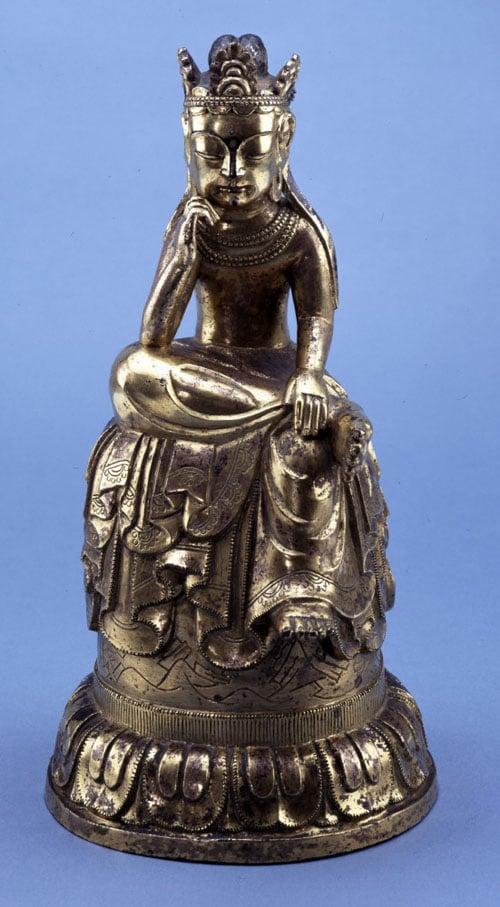 An example of one of the earliest Buddhist images in Japan. Early Nara period. Depicts either Sakyamuni in his youth, or Maitreya, the Buddha of the future. Image close in style to Korean work. Pose characteristic. Landscape decorating the sides of the figure symbolise the retreat into wild nature achieved through deep meditation.