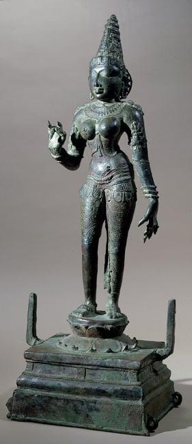 Bronzes of the early Chola period (ninth-tenth century) are the most celebrated creations of Indian art. The Ashmolean Museum lacked any example from this phase until it acquired this work in the year of retirement of its keeper of Eastern Art, J.C. Harle. The right hand of this standing Parvati makes a gesture called kataka hasta, which is suitable for the insertion of a bud or blossom; and sometimes a bronze flower is actually held.