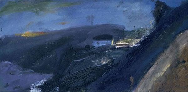 Kate Downie has spent the last 20 years exploring an artistic vision for the extremes of both the Scottish urban/industrial landscape as well as the more isolated coastal places, as in this work which depicts a small house amongst rugged coastal hills. This work was made when the artist set up a studio in the remote peninsular of Old Slains. The artist describes the work as about 'the calligraphy of erosion' - the coastline is not a fixed entity but as fragile and open to change as our society and social identity.
