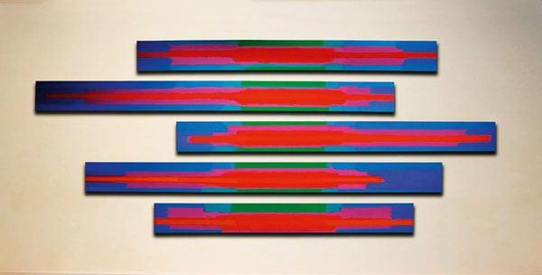 This work was based on the rocket thrust witnessed by the artist in 1972 at the launch of Apollo 17, the first night-time launch of a space mission. The sight of such sublime beauty and power against the night sky inspired the luminous, almost incandescent colours and innovative five-part format. It was painted in Florida by Bell, a member of the St Ives School from the pioneering period of the mid 1950s, and is the culmination of a series of works.