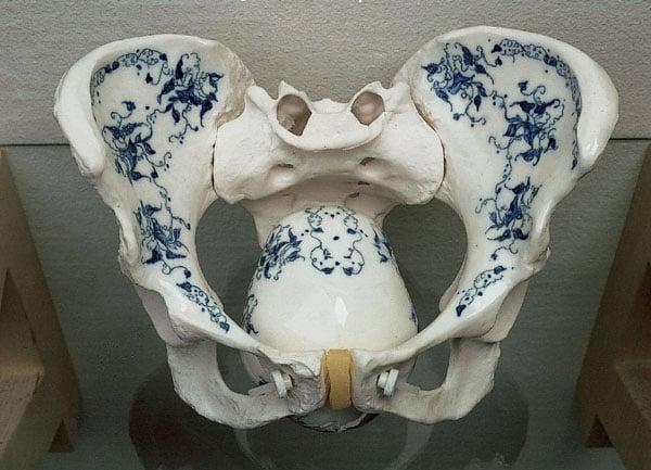 A conceptual work made of porcelain containing bone ash. They are based on Oriental patterns adapted from traditional 19th Century English tableware but in place of the delicate cups and saucers are five skulls placed within five pelvises, laid out in a line of wall-mounted perspex boxes.
