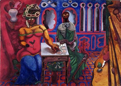 Burra was preoccupied with the low life of Mediterranean ports and visits to the continent introduced him to the mix of French, Arab, and Negro people who populatef his work from the mid-1920s onwards. Burra was fascinated with skulls and skeletons and often used dice and card players in his works. These are not mere cafe games; they suggest a far more sinister meaning. All these elements are combined within an exotic Moorish setting in this work - a visual catalogue of Burra's preoccupations during this period.