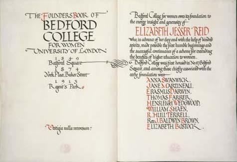 A fine example of the work of Johnston, the Calligrapher, in the shape of the two opening pages of a Founders' Book of Bedford College, written in black and red.