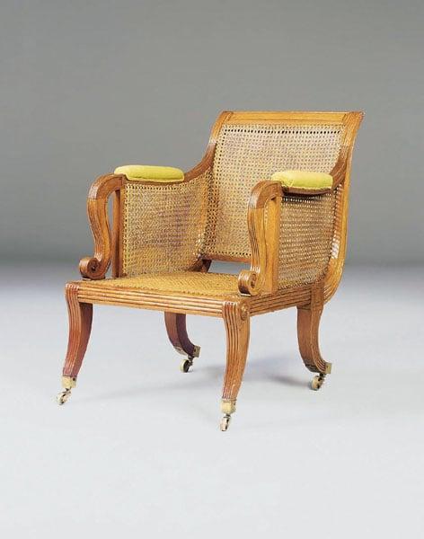 These Grecian-scrolled library bergeres have incised 'tablet' rails and truss-pillared arms with volutes enriched with paterae en suite with the legs. They formed part of a set of four mahogany caned Library chairs supplied in 1814 for George Home's Library at Paxton House, Berwickshire by William Trotter of Prices Street, Edinburgh, at a cost of £7.70 each. The current set has one modern chair.
