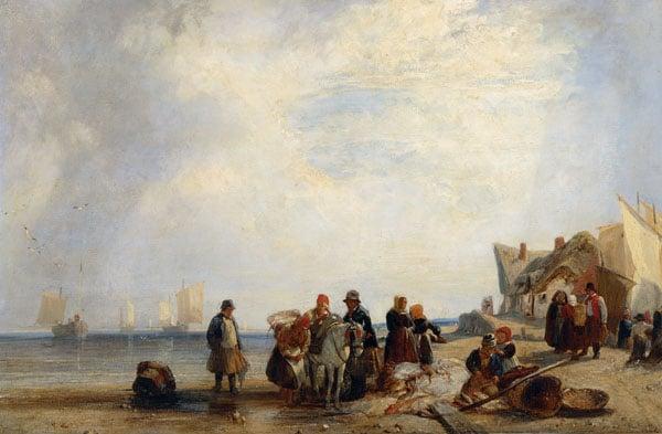 Beach at low tide, in rich morning or evening light with the sun reflected in glistening sands. A group of fishermen and women stand in the foreground, with a horse, various baskets and the day's catch. It was this type of work by Bonington that JWM Turner later famously paid hommage to with his work 'Calais Sands' (1830).