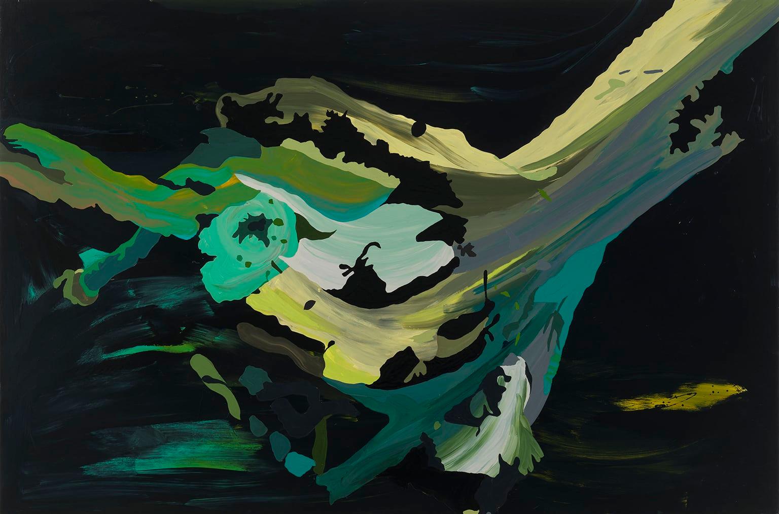 Clare Woods creates semi-abstract landscapes inspired by her own photographs of vegetation and undergrowth. Funnelled Hole, a characteristic work rendered on aluminium in sharply contrasting colours, featured in her 2012 solo exhibition, ‘The Dark Matter’, at Southampton City Art Gallery.
