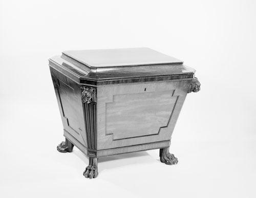 A group of furniture includes a French Empire stool, a 'Sheraton' mahogany sideboard, a Regency wine-cooler, a clock, and a pair of 18th century French gilt wall-brackets. Part of a collection of 13 works distributed to the Ashmolean Museum, Oxford; the Victoria and Albert Museum, London and the National Maritime Museum, London.