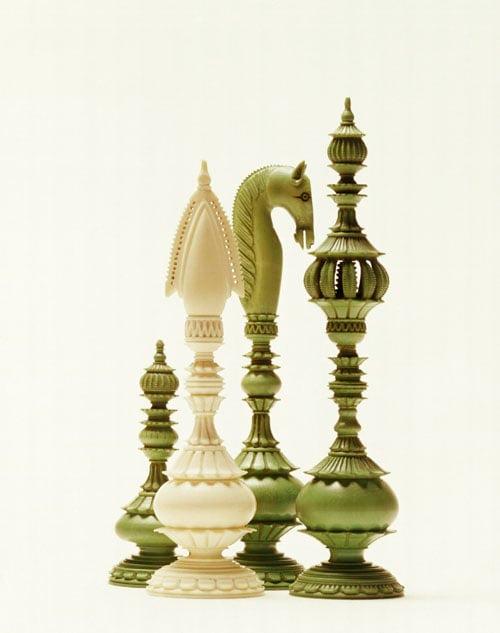 Table for chess and backgammon made of different woods and ivory, inlaid in parquetry with designs of the period thought to belong to Samuel Pepys or one of his contemporaries. Sets of chessmen and draughtsmen and a box for dice, all in ivory, now thought to be Indian and date to the 19th century.