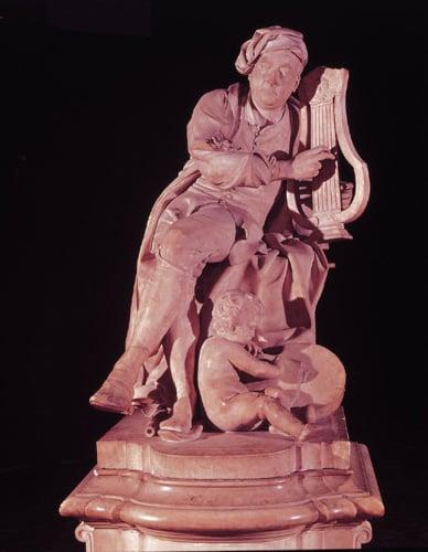 This marble statue of Handel in the guise of Apollo was Roubiliac's first major commission ordered for the pleasure-gardens at Vauxhall, where Handel's music was often performed. It was the first fully rococo figure to be carved in this country and the most vivid likeness of the great composer in his prime. The statue shows Handel at the age of 53, when he dominated the musical life of London. It was carved shortly after the successful first performance of Alexander's Feast, and the score of this work is among those represented under the left arm of the composer. Handel is shown as a slippered Apollo playing his lyre but seated informally and wearing a cap. A putto at his feet transcribes the melody.