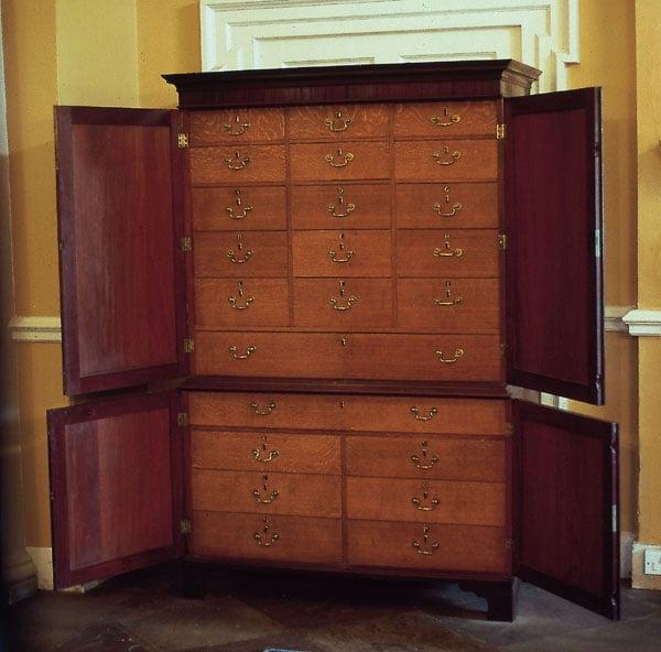 Estate cabinet with a pair of fielded panel doors enclosing an arrangement of seventeen drawers marked 'A' to 'I'. The lower section has a conforming pair of fielded panel doors enclosing one long and six short drawers with the letters 'K' to 'P'.