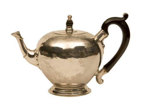 George II bullet shaped tea pot on circular moulded foot, engraved round the shoulder with a band of shells, strapwork and foliage. The curved spout has a fluted lower part. Maker's mark IC (?Isaac Cookson).