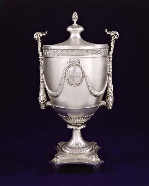 Two-handled tea vase and cover. It stands on a square base with four tapering feet and fluted stem. The upper part is chased with laurel festoons and two oval medallions, one enclosing the figure of Minerva at an altar, the other engraved with a coat of arms (Boulton quartering Lowth, Robinson and Babington).