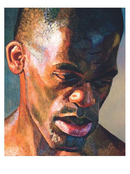 A large portrait of the head of Ben, a fellow artist. Nahem and Ben have worked together in Hartlepool running artistic workshops and one of Nahem's main aims is to inspire children from disadvantaged backgrounds to achieve their ambitions. He sees his art and his own experiences as a way of doing this.